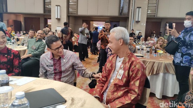 Ganjar dan Sandiaga bertemu di acara rapat koordinasi daerah dan pleno TPKAD se-Jawa Tengah di Hotel Gumaya Semarang, hari ini. Dalam momen itu, Ganjar yang kini berstatus sebagai capres ditanya apakah merasa cocok dengan Sandiaga sebagai calon wakil presiden (cawapres).