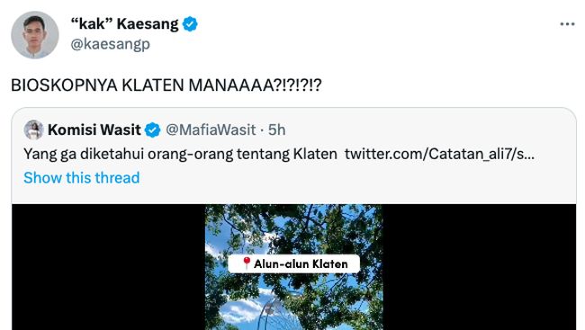 Putra bungsu Presiden Jokowi, Kaesang Pangarep tiba-tiba menanyakan keberadaan bioskop di Kabupaten Klaten. Hal itu dilontarkan ketika akun Twitter @Mafi*** mengungga video mengenai klaten yang diplesetkan.