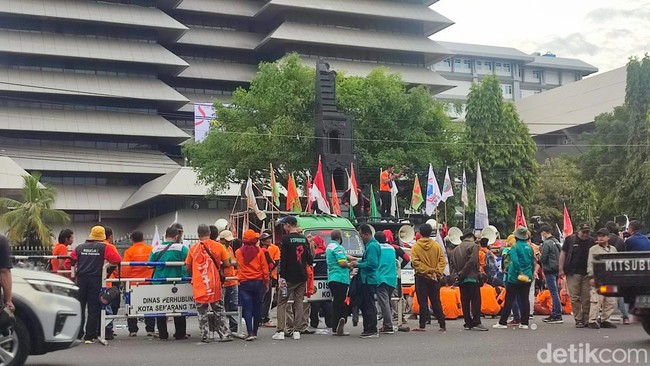 Massa buruh Jawa Tengah (Jateng) melakukan aksi peringatan Hari Buruh Internasional atau May Day di depan Kantor Gubernur Jateng Ganjar Pranowo. Di tengah aksi, ada massa yang curhat jika tempatnya bekerja mencicil Tunjangan Hari Raya (THR) Lebaran.