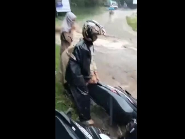 Dalam video tersebut, terlihat tiga unit sepeda motor terjebak banjir. Bahkan dua unit sepeda motor terlihat roboh akibat derasnya air yang mengalir di jalan raya.