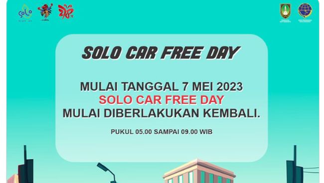 "SOLO CAR FREE DAY diselenggarakan kembali pada tanggal Minggu, 7 Mei 2023 mulai pukul 05.00 WIB -pukul 09.00 WIB," tulis Dishub Kota Solo seperti dilihat detikJateng, Jumat (5/5/2023).