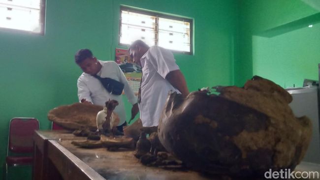 Pengamatan detikJateng, benda kuno temuan berupa talam, mangkok, patung logam, guci dan lainnya disimpan di kantor desa. Diletakkan di atas meja kayu beralas kaca.