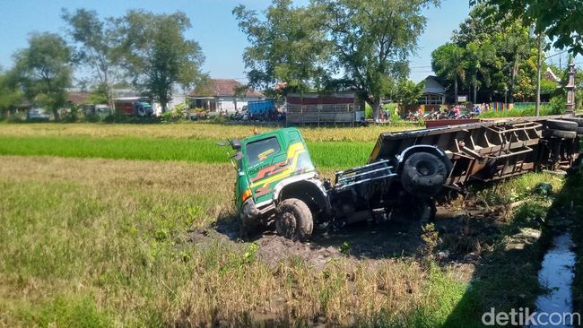 Kecelakaan lalu lintas terjadi di jalan Pakis-Daleman, Desa Bentangan, Kecamatan Wonosari, Klaten. Satu unit truk kontainer terjun ke sawah setelah bersenggolan dengan truk dan sepeda motor.