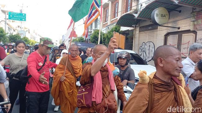 Saat sampai di Klenteng Tek Hay Kiong Selasa (23/5/2023) sore, 32 biksu atau bhante yang menjalani Ritual Thudong disambut seni barongsai. Ratusan warga Kota Tegal tampak antusias menyambut kedatangan biksu saat memasuki kompleks klenteng.