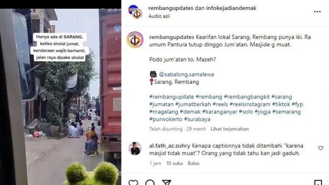 "Kearifan lokal Sarang, Rembang punya iki. Ra umum Pantura tutup dinggo Jum'atan. Masjide g muat. Podo jum'atan to, Mazeh?," tulis akun tersebut.
