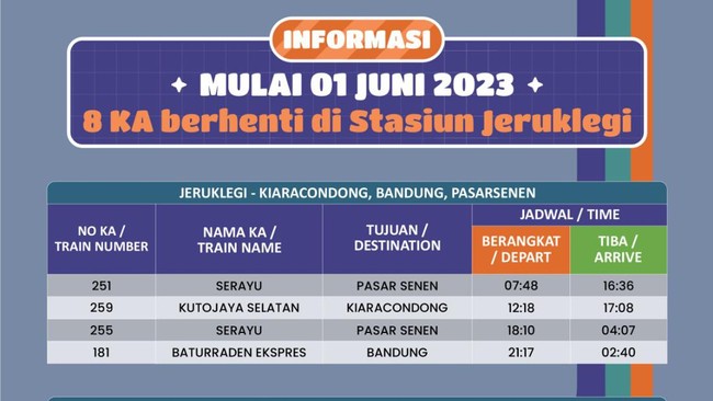 "Masyarakat sudah dapat melakukan pemesanan tiket dengan mengakses melalui aplikasi resmi KAI Access serta channel eksternal lainnya yang telah bekerja sama dengan KAI untuk perjalanan mulai 1 Juni 2023. Ada perjalanan KA Kutojaya Selatan, Serayu dan Baturraden Ekspress yang naik maupun turun di Stasiun Jeruklegi," imbuh Daniel.