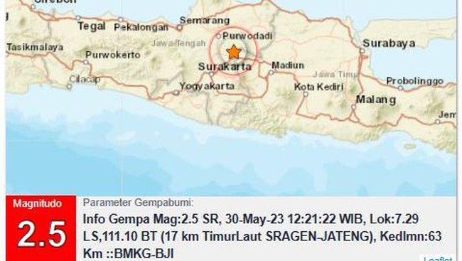 Gempa bumi berkekuatan magnitudo (M) 2,5 terjadi di Kabupaten Sragen, Jawa Tengah, siang ini. Pusat gempa berada di darat.