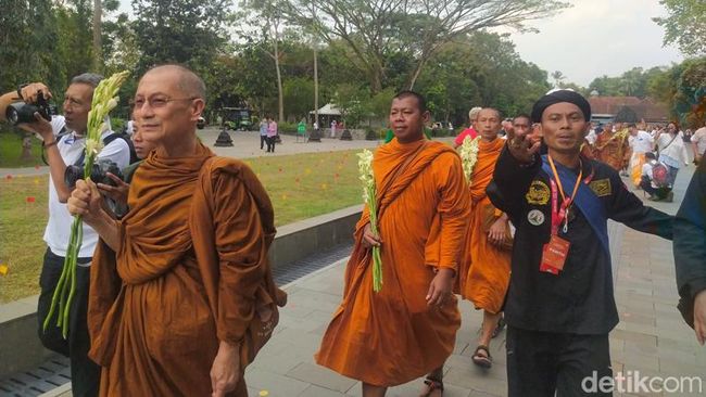 Para biksu thudong ini mendapatkan untaian bunga sedap malam. Mereka kemudian berjalan melalui marga utama dan terus naik bangunan Candi Borobudur untuk melakukan peribadatan.