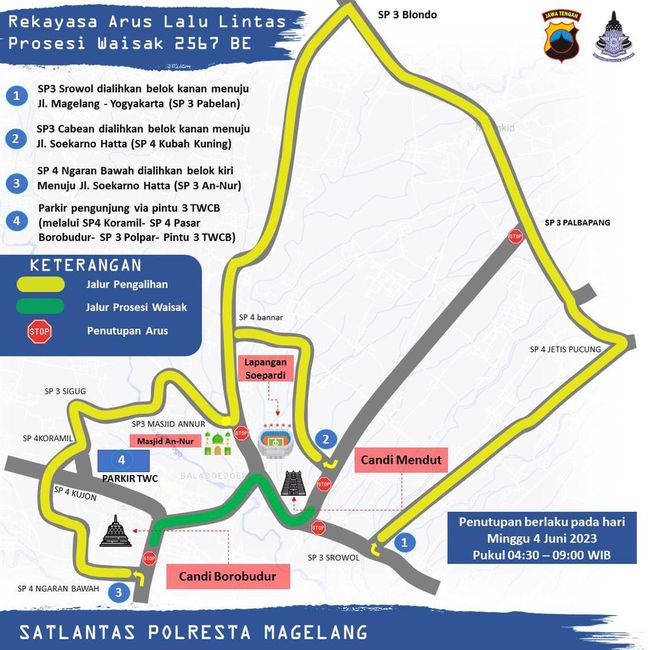 Polresta Magelang besok akan melakukan rekayasa arus lalu lintas terkait prosesi detik-detik Waisak 2023. Rekayasa ini akan dilakukan terutama saat arak-arakan dari Candi Mendut menuju Candi Borobudur.