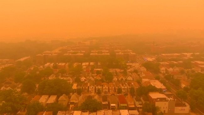 Kebakaran hutan yang melanda Kanada berdampak hingga New York. Langit di New York kini memerah disertai kabut asap.