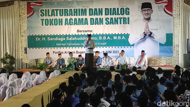 Menparekraf Sandiaga Uno melakukan kunjungan ke Pondok Pesantren Bugen Al-Itqon Semarang. Dalam kunjungannya itu, selain agenda sebagai menteri juga menjalankan 'ospek' untuk masuk ke PPP.