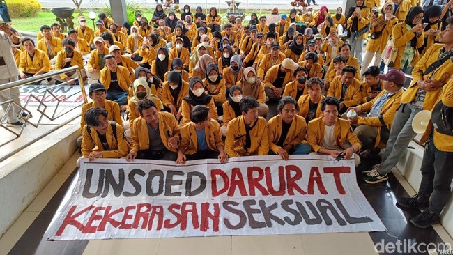 Puluhan mahasiswa menggelar aksi di depan Gedung Rektorat Universitas Jenderal Soedirman (Unsoed) Purwokerto, Kabupaten Banyumas. Mereka mendesak adanya pengusutan kasus dugaan kekerasan seksual yang terjadi di kampus.