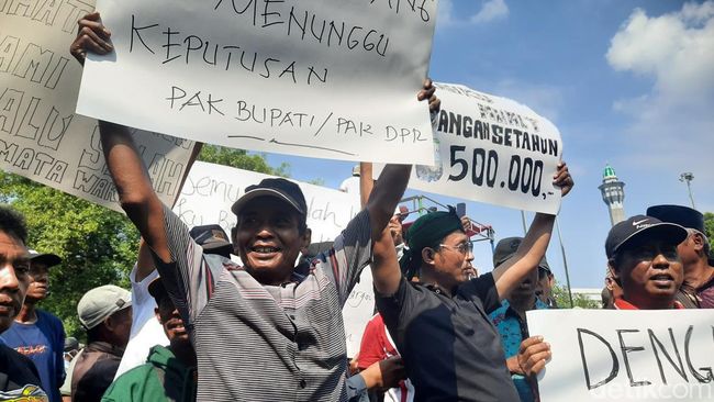 Pantauan detikJateng di lokasi, Kamis (21/6/2023), massa memadati kawasan depan kantor Bupati Pati. Massa membawa berbagai spanduk tulisan meminta kenaikan tunjangan kesejahteraan bagi ketua RT dan RW. Di antaranya 'Mergawene Rekoso Gajine Mentolo', 'Tunjangan Setahun Mung Rp 500.000', 'Kami datang menunggu keputusan Pak Bupati/Pak DPR'.