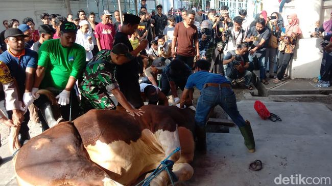 Proses penyembelihan hewan kurban itu ramai ditonton warga. Panitia membuat pagar pembatas, agar warga yang menyaksikan tidak terlalu dekat.