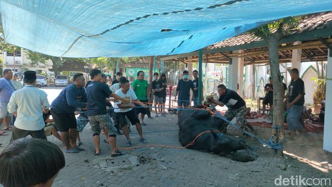Dari pantauan detikJateng, awalnya sapi kurban Jokowi itu manut saat ditali di dekat tempat penyembelihan. Lalu ada tiga orang jagal yang mencoba menjatuhkan badan sapi dengan memegang buntut sapi.