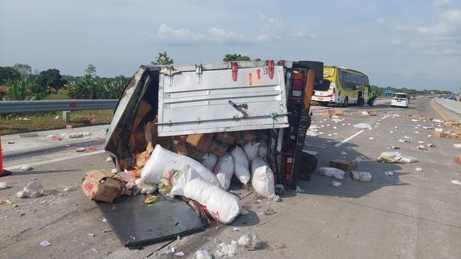 Truk tersebut akhirnya oleng dan membentur beton pembatas jalan hingga akhirnya terguling.