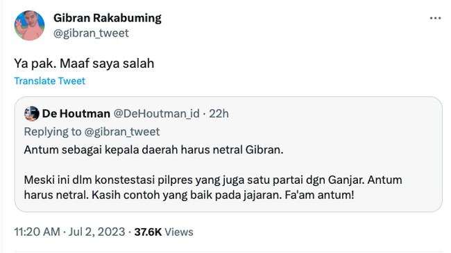 "Ya pak. Maaf saya salah," ucap Gibran melalui Twitter pribadinya.