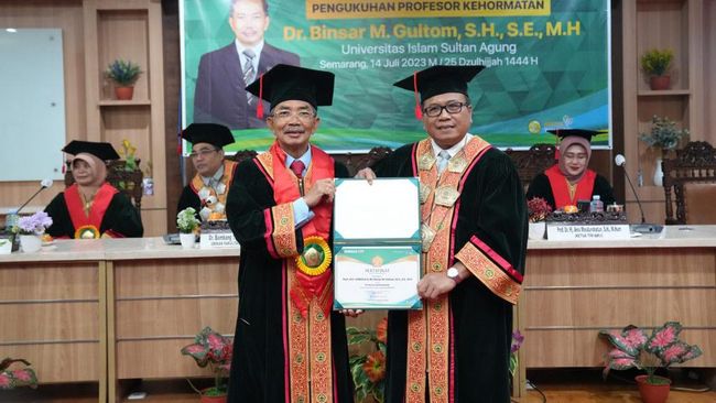 Hakim Binsar M Gultom atau yang lebih dikenal dengan hakim 'kopi sianida' dikukuhkan sebagai guru besar Profesor Kehormatan di Universitas Islam Sultan Agung (Unissula) Semarang. Dalam orasinya ia mengungkit soal penyelesaian pelanggaran HAM berat.