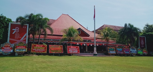 Tidak hanya di depan gedung paripurna, di halaman pendopo, di kanan dan kirinya berjajar karangan bunga serupa. Ucapan selamat tersebut berasal dari organisasi perangkat daerah (OPD) Pemkab Klaten.
