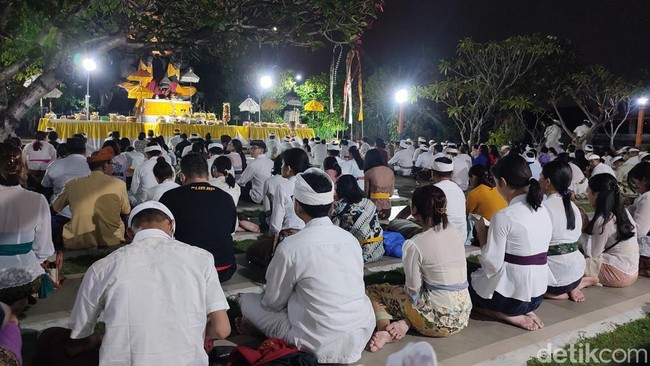 Pantauan detikJateng di Pura Agung Giri Natha, Gajahmungkur, Semarang, Rabu (2/8/2023), terlihat para umat Hindu telah meramaikan pura sekitar pukul 19.15 WIB. Mereka duduk dan memenuhi area pura dengan rapi.