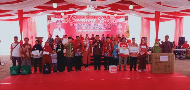 Para pejabat Pemkab Klaten dipimpin Bupati Klaten, Sri Mulyani menghadiri acara Sambang Warga di Desa Wonoboyo, Kecamatan Jogonalan, Klaten. Lokasi acara berada di kawasan situs temuan harta karun emas Wonoboyo.