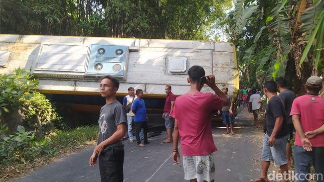 Pantauan detikJateng di lokasi, Senin (7/8/2023) pukul 15.00 WIB, bus berpelat AA 7504 QA tersebut masih dalam posisi terguling.