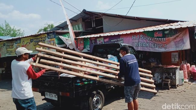 Pasar darurat di Jalan Kopral Sayom, Karanganom, Klaten Utara, Klaten ditutup mulai besok (10/8). Pedagang mulai bertahap mengosongkan kios dan lapak darurat untuk persiapan pindah ke Pasar Gedhe Klaten.