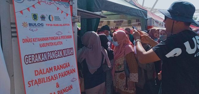 Antrean puluhan ibu-ibu rumah tangga berjubel saat pameran tersebut mau dibuka. Warga membawa KTP antre di depan mobil boks Bulog dan Pemkab Klaten.