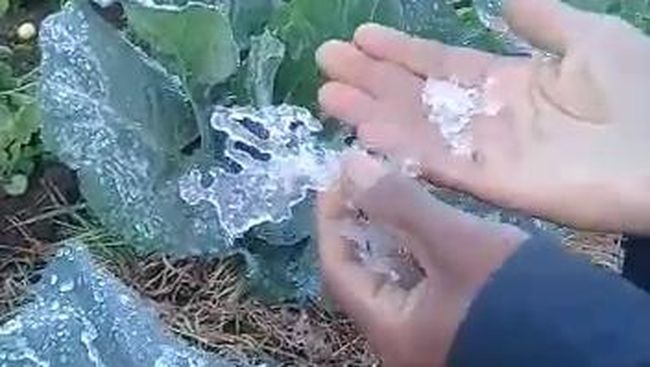 Ia menyebut dinginnya suhu udara di dataran tinggi Dieng pagi tadi membuat genangan air di daun kubis membeku. Sehingga saat diambil terlihat seperti kumpulan es batu.