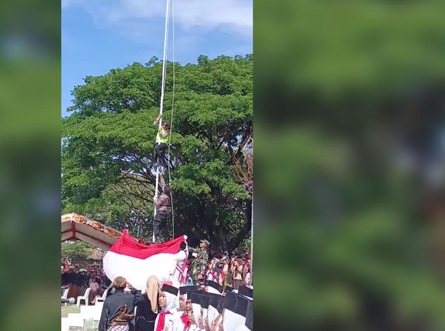 Insiden tali terlepas dalam pengibaran bendera terjadi dalam upacara Hari Ulang Tahun (HUT) ke-78 RI di lapangan Juwangi, Kabupaten Boyolali. Beruntung, seorang polisi sigap memanjat tiang setinggi sekitar 10 meter itu. Begini kisahnya.