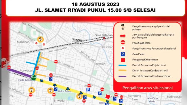 Pemkot Solo akan menggelar karnawal pawai pembangunan dalam rangka HUT ke-78 RI, Jumat (18/8/2023) hari ini. Gelaran yang dipusatkan di Jalan Slamet Riyadi mulai dari simpang empat Gendengan hingga Balai Kota Solo.