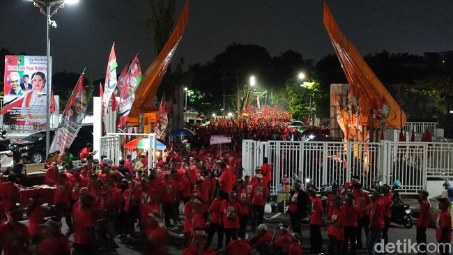 Puluhan ribu kader PDIP mulai memadati area apel siaga pemenangan Pemilu 2024 di Stadion Jatidiri Semarang. Kader PDIP sudah berdatangan sejak sore hari.