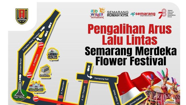 Sementara itu, dari keterangan tertulis Pemkot Semarang, pawai mobil karnaval bunga tahun ini dikolaborasikan dengan kirab pembangunan dalam rangka memperingati HUT ke-78 RI dan bernama Semarang Merdeka Flower Festival. Meski penutupan jalan dilakukan pukul 12.00 WIB, namun acara dimulai pukul 15.00 WIB.