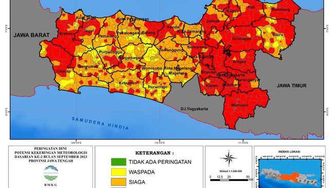 Badan Meteorologi, Klimatologi, dan Geofisika (BMKG) mengeluarkan peringatan dini kekeringan meteorologis di Jawa Tengah. Banyak daerah di Jateng yang sudah masuk kategori awas atau merah.