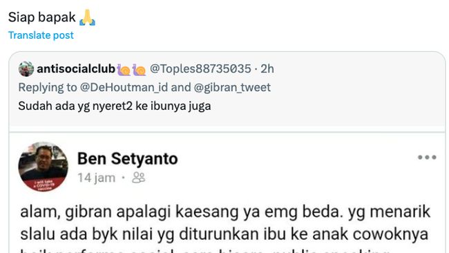 "alam, gibran apalagi kesang ya emg beda. yg menarik slalu ada byk nilai yang diturunkan ibu ke anak cowoknya baik performa sosial, cara bicara, public speaking "ketulusan" dst. apa lagi? .. mbak siti atiqoh lulusan S2 kebijakan publik dan ibu iriana mewakili profil ibu RT yg biasa2 aja, tentu sj standar2nya jg beda. normal itu. lalu ada yg tanya..kok kaesang slengekan..lha emg ibunya g?" tulis akun yang sudah direpost oleh akun lain @Toples*** seperti dilihat detikJateng, Senin (25/9/2023).