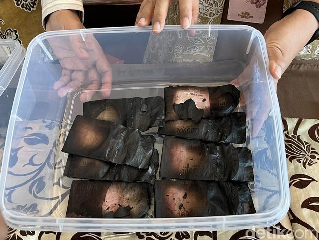 Terlihat pinggir uang pecahan Rp 100 ribu itu sudah gosong berwarna hitam. Sedangkan bagian tengah uang tersebut masih terlihat warna aslinya.