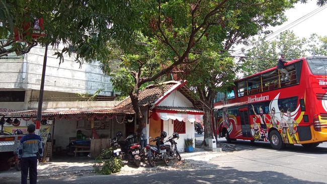 Bus tingkat wisata Werkudara milik Pemkot Solo tersangkut saat melintas di depan SMA Negeri 2 Solo, atau di jalan Monginsidi, Kelurahan Gilingan, Kecamatan Banjarsari, Solo, hari ini.