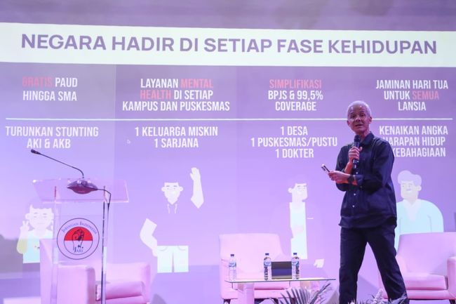 Dalam forum tersebut, Ganjar berbagi konsep dan strategi dalam membangun bangsa ke depannya. Menurutnya, negara harus hadir di setiap fase kehidupan, mulai dari gratis biaya sekolah, layanan mental health, simplifikasi BPJS, dan jaminan hari tua untuk lansia.