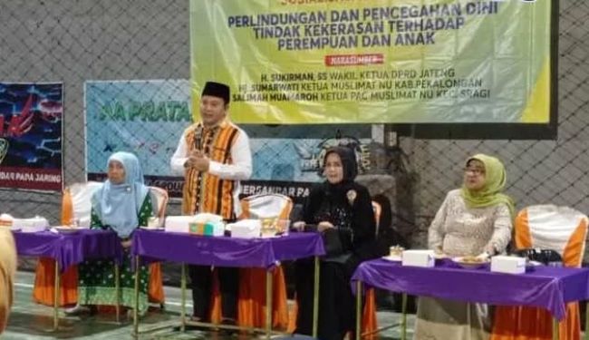 Wakil Ketua DPRD Jateng H. Sukirman menggelar kegiatan sosialisasi non-perda tentang perlindungan dan pencegahan dini tindak kekerasan terhadap perempuan dan anak kepada ibu-ibu Muslimat Kecamatan Sragi, Pekalongan di AA Pratama. Sosialisasi bertujuan untuk memberikan rasa aman kepada perempuan dan anak dalam pemenuhan hak-haknya.