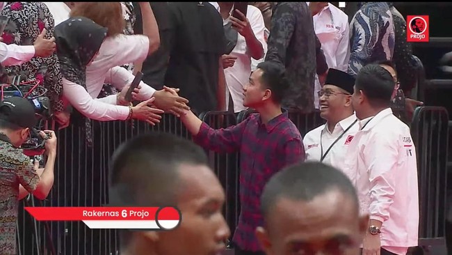 Putra sulung Presiden Joko Widodo (Jokowi) itu langsung disambut oleh tepuk tangan dan teriakan dari relawan Projo. Gibran menghampiri beberapa relawan Projo dan menyalaminya sebelum beralih menghampiri para partai Ketum Koalisi Indonesia Maju yang duduk di barisan paling depan.