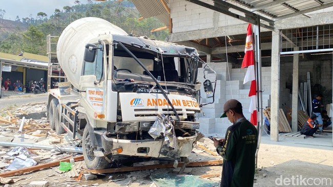 "Awalnya melaju dari arah timur ke barat dengan kecepatan sedang. Sesampainya di TKP jalan menurun, truk mixer (molen) kehilangan fungsi rem kemudian menabrak kanopi rumah milik Sulastri kemudian menabrak SPM honda CB yang terparkir. Truk juga menabrak tembok serta kanopi warung dan berhenti di depan toko material," ujar Edi, Senin (16/10/2023).