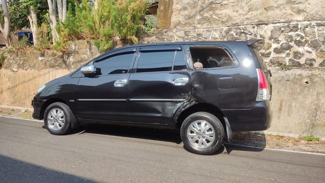 Akibatnya mobil dinas rusak di bagian belakang kiri. Kaca mobil di bagian itu pecah.