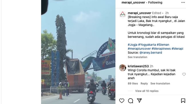 Video kecelakaan ramai di media sosial setelah diunggah di Instagram oleh akun @merapi_uncover. Dalam video tersebut terlihat truk masih dalam kondisi berada di bawah gapura tugu selamat jalan.