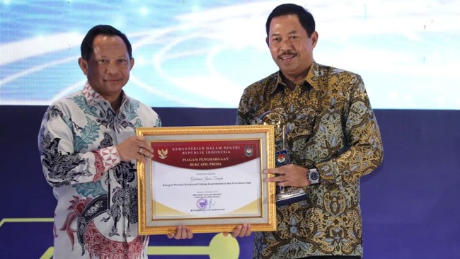 Penghargaan diserahkan oleh Mendagri Tito Karnavian kepada Pj Gubernur Jawa Tengah Komjen Pol (P) Nana Sudjana pada acara Rakornas Dukcapil yang berlangsung di Hotel Novotel Palembang pada Selasa (24/10) malam.