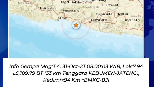 "Info Gempa Mag:3.4, 31-Oct-23," demikian dikutip dari akun resmi Instagram BMKG Stasiun Geofisika Banjarnegara @bmkg_banjarnegara, Selasa (31/10/2023).