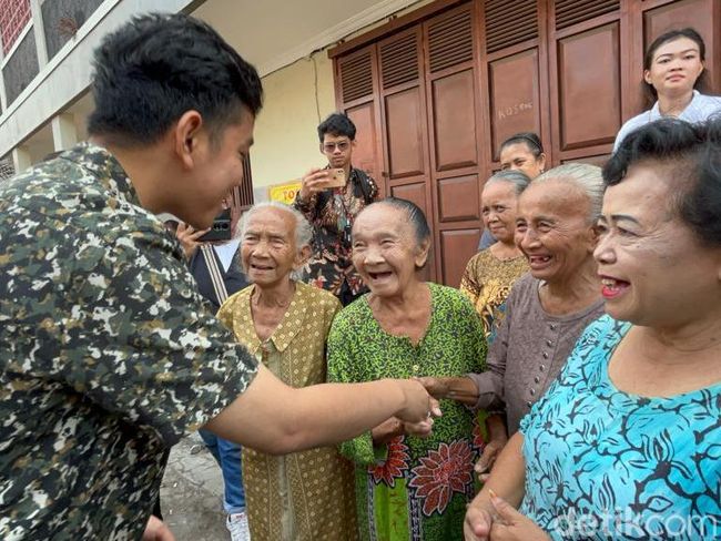 Pantauan detikJateng, Gibran menyalami satu-satu warga yang telah menunggu di depan. Sejumlah warga tampak semringah melihat Gibran datang ke kampungnya.