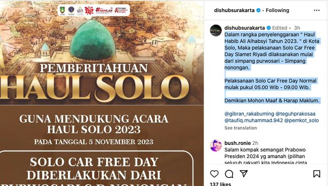 "Dalam rangka penyelenggaraan "Haul Habib Ali Alhabsyi Tahun 2023" di Kota Solo, Maka pelaksanaan Solo Car Free Day Slamet Riyadi dilaksanakan mulai dari simpang purwosari - Simpang nonongan," tulis akun tersebut seperti dilihat detikJateng, Rabu (1/11/2023).