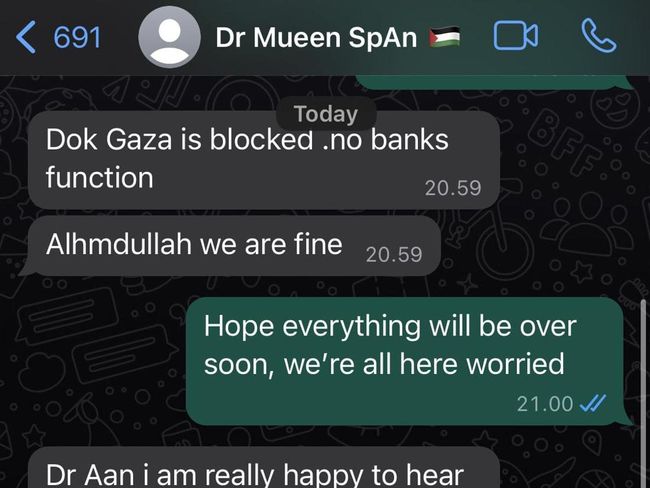 Keduanya sempat bertukar kabar melalui pesan WhatsApp. Saat itu dr Mueen mengabarkan wilayah Gaza diblokade dan sistem perbankan tidak berfungsi.