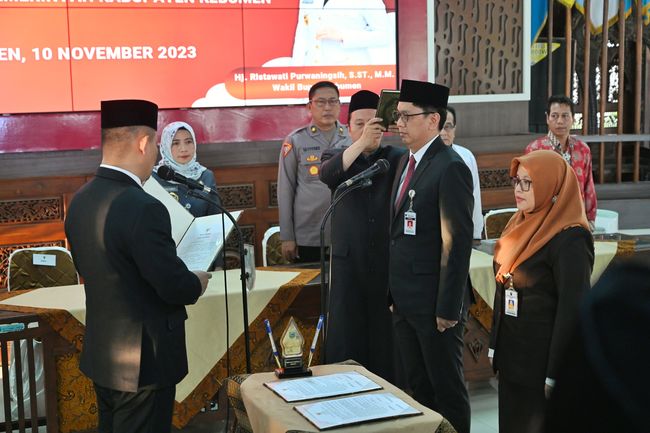 Pelantikan berlangsung di Pendopo Kabumian, Jumat (10/11/2023). Turut hadir dalam acara tersebut jajaran Forkopimda, kepala OPD, camat dan perwakilan kepala desa.