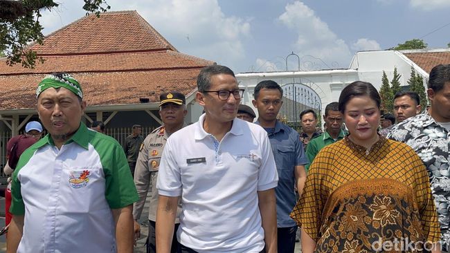 Menparekraf Sandiaga Salahuddin Uno mendatangi Puro Mangkunegaran, Solo. Sandiaga hadir untuk mengunjungi festival kreasi mi ayam.